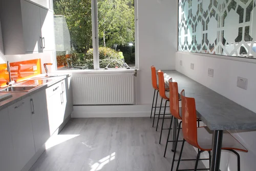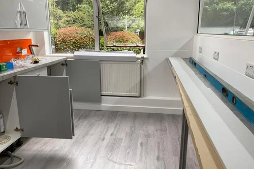 Once the initial preparation works were complete we could begin the process of transforming the rooms. We begun with laying the carefully planned carpet layout along with luxury vinyl tiles for the kitchen areas, which we installed including worktops and a breakfast bar with an integrated undercounter fridge.