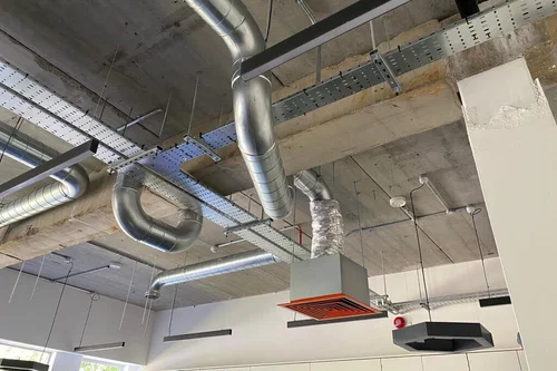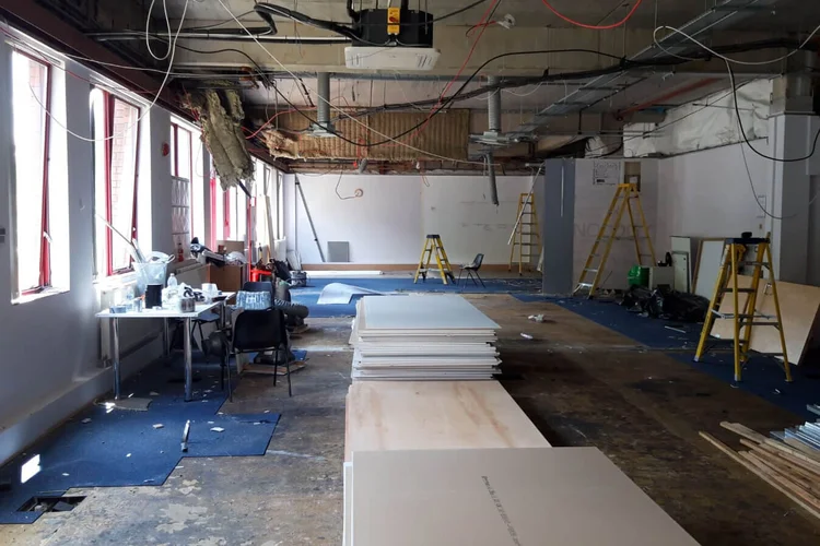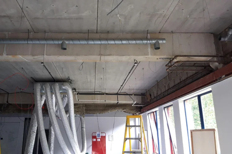 Firstly all of the existing furniture and contents including partitions were removed to make room for the upcoming works. Flooring tiles were uplifted and disposed of as well as ceiling tiles in order for us to introduce a contemporary exposed ceiling. All remaining surfaces were prepared and temporary protection was added to windows to hide ongoing works.