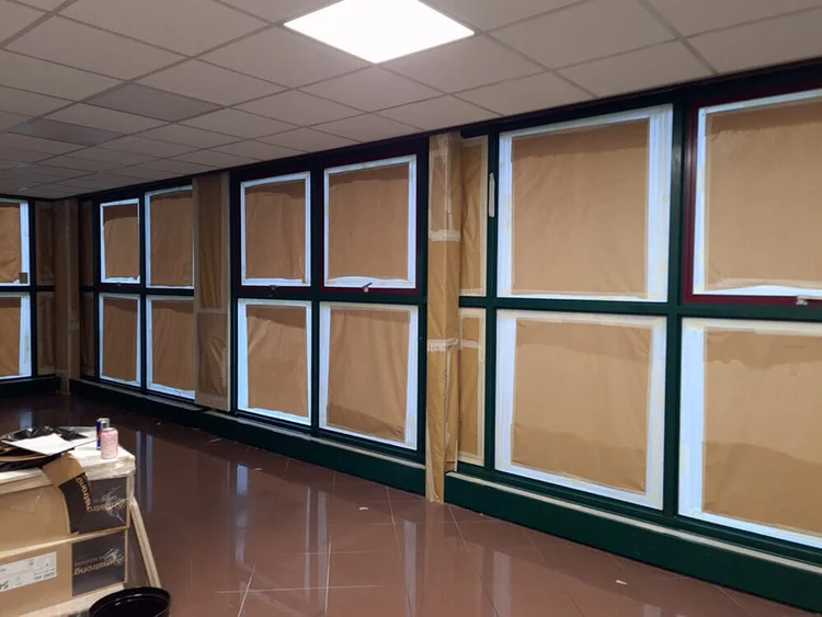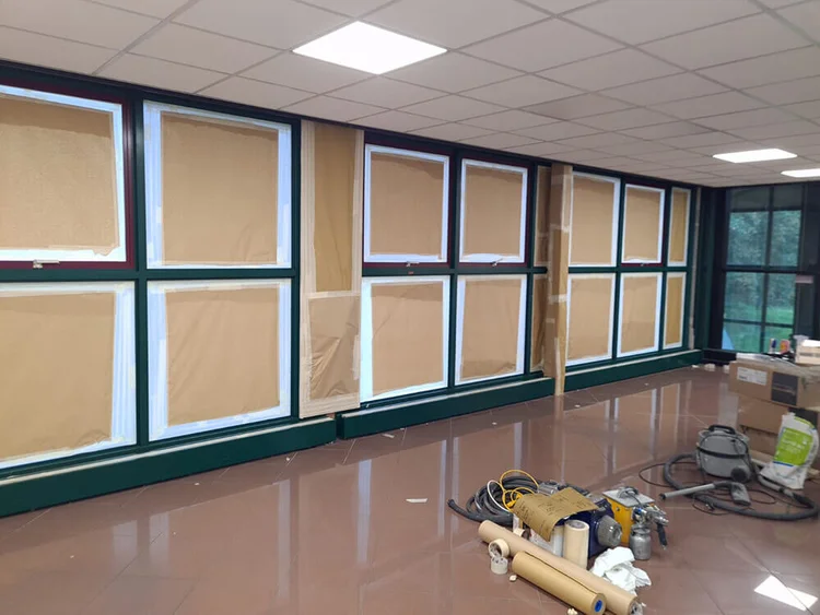 Once cleared, we installed brand-new suspended ceiling tiles, giving the space a brighter, cleaner appearance. The existing windows were carefully masked and spray-painted, achieving a sleek, uniform finish that complemented the new colour palette. The walls were redecorated, ensuring consistency throughout and tying the scheme neatly into the company’s branding colours.